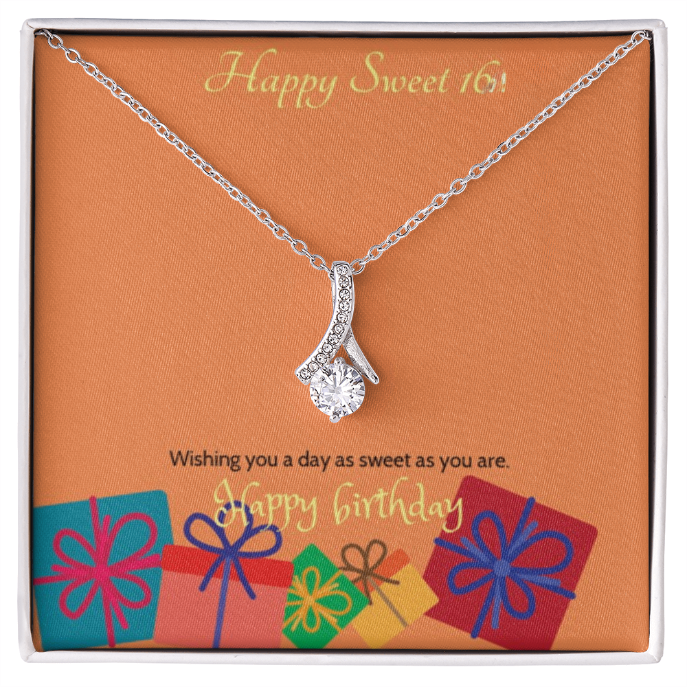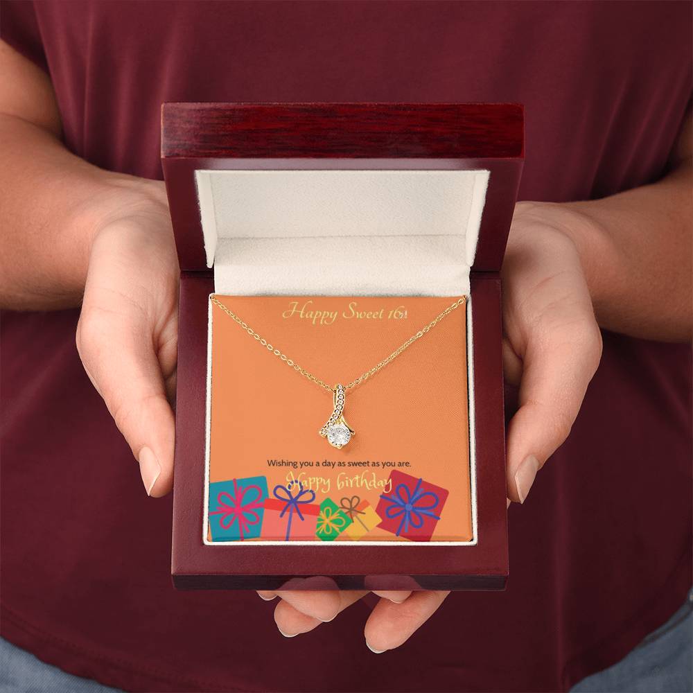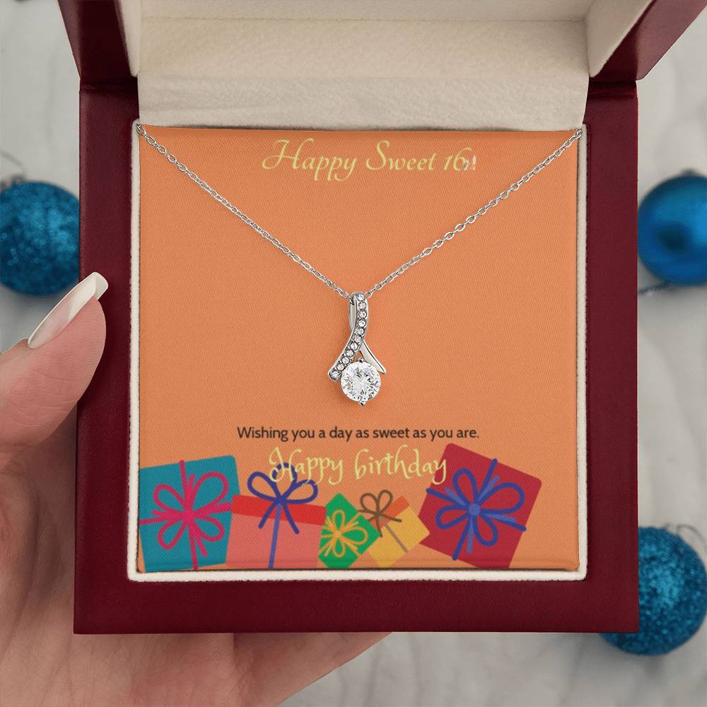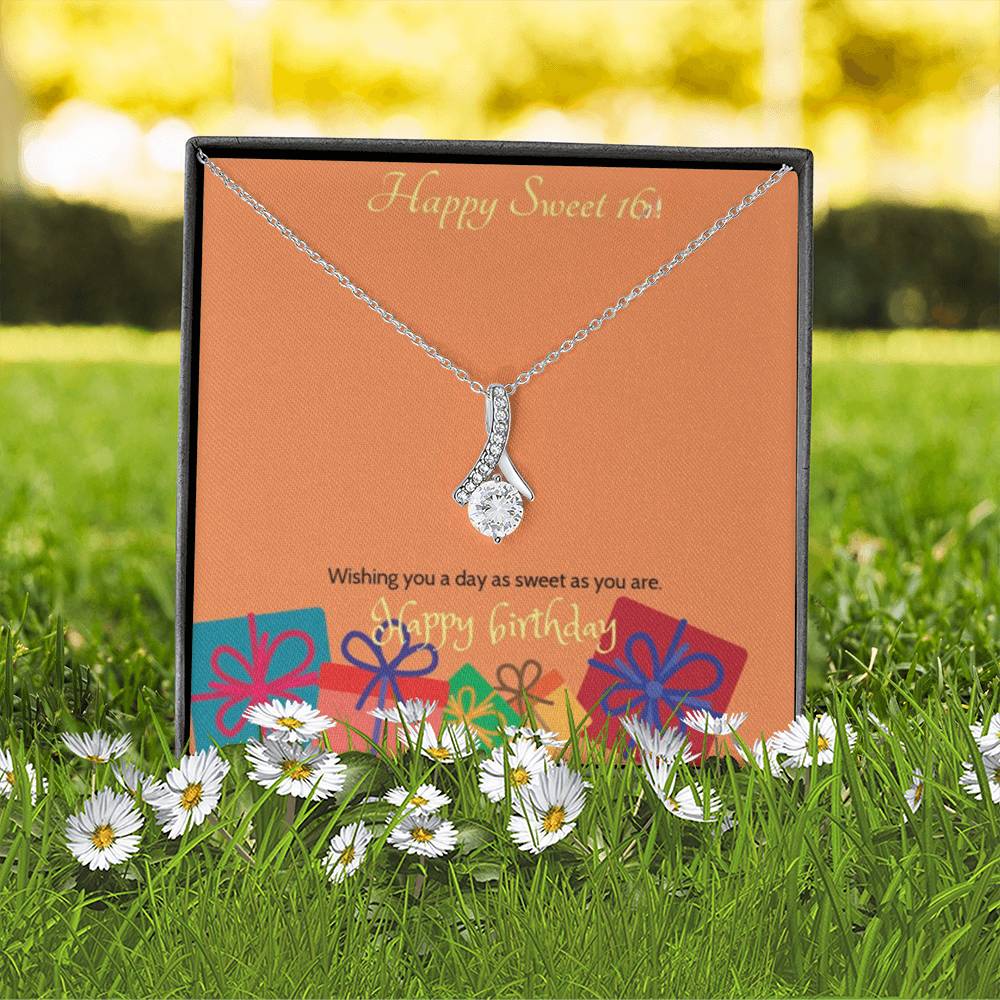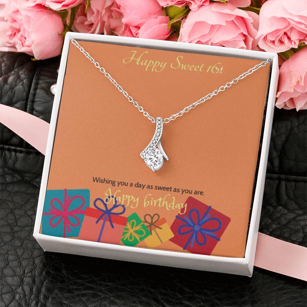 Celebrate her milestone with the Sweet Blossom Necklace, the perfect Sweet 16 gift for your daughter, granddaughter, sister, niece, or best friend. This elegant ribbon pendant with sparkling cubic zirconia is designed to capture the joy and beauty of turning sixteen.